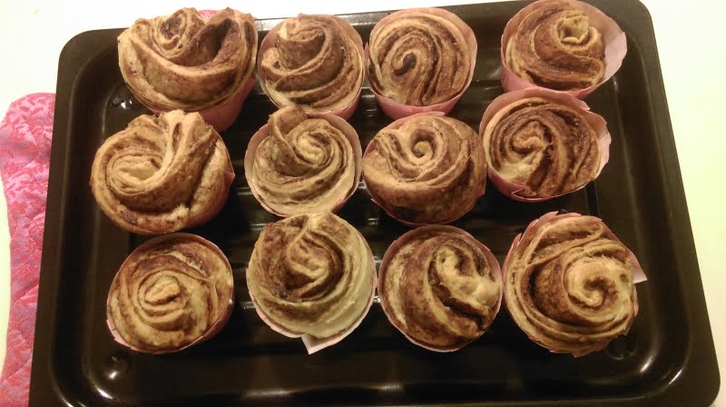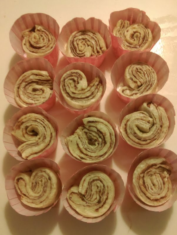 拿出來之後因為米飯麵包的麵糰有黏性,所以我在桌面、手上和擀麵棍上都抹了沙拉油。用類似辮子麵包的方式把巧克力醬抹進去,但是不要切成三條編辮子。改切成十二條小條。(我的切法是先十字切成四塊,每塊再沿長邊切成三小條。)把每一個小條條捲起來放進紙杯裡,像右邊的照片這樣。