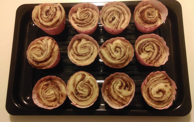 然後排上烤盤,放進烤箱,開最低的溫度(我的烤箱是50度)五分鐘,讓烤箱裡的溫度稍微升高,然後就不要打開,讓麵糰和熱氣留在裡面發。(當然天氣好的話不開也可以,或者旁邊有空間放杯熱水或加一層熱水烤盤在下面之類的方式也可以。)二發的時間大概是半小時到一小時,就時不時去看一看,發現杯子大約滿了就可以準備烤了。(欸)二發之後的狀態如左圖。